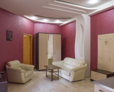 В гостиной: кресло, двуспальный диван, платяной шкаф, журнальный столик, большой плазменный телевизор, DVD player, мини холодильник, кондиционер, чайник, посуда, сейф (по запросу). Возможно предоставление доп. места.